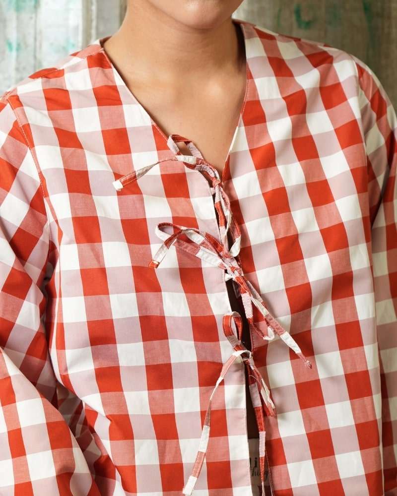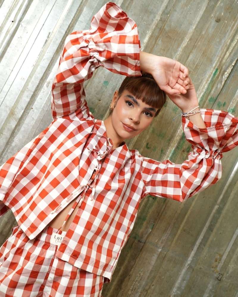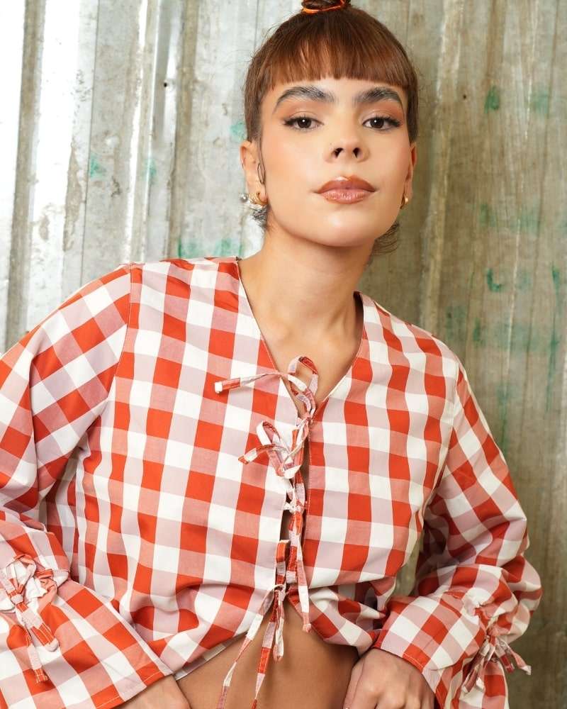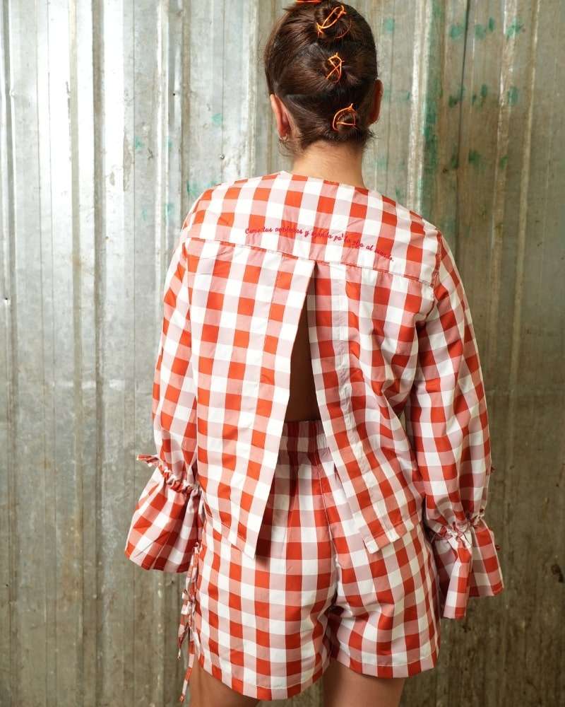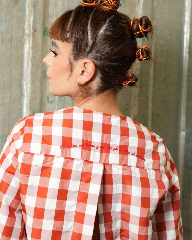 Camisa hecha en algodón popelina 100%, color naranja con cuadros blancos, mangas globo con cuerda para ajustar, tiras como cordones en parte de en la parte de enfrente, silueta slim/clasica, abertura en espalda y bordado en color rojo "come tus verduras y manda pa la pija al mundo".