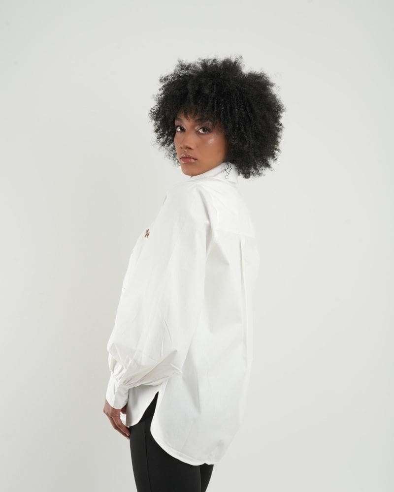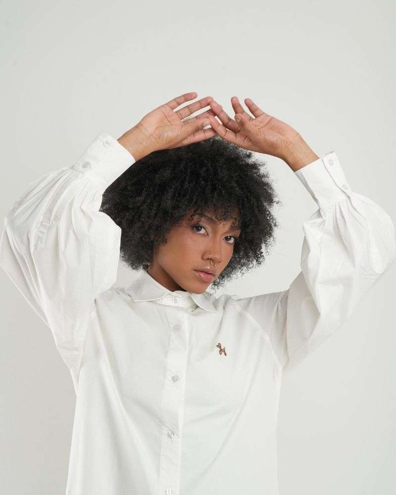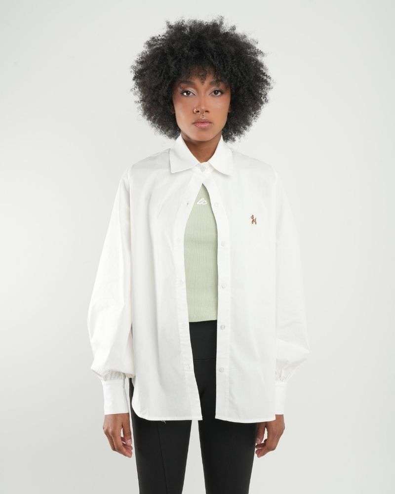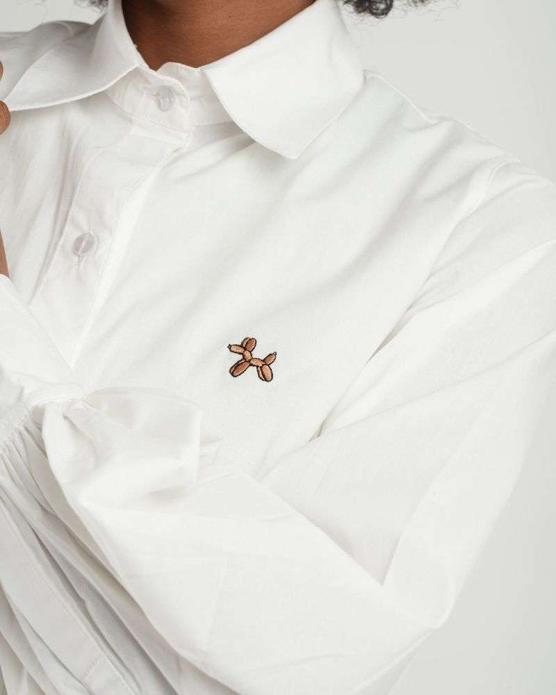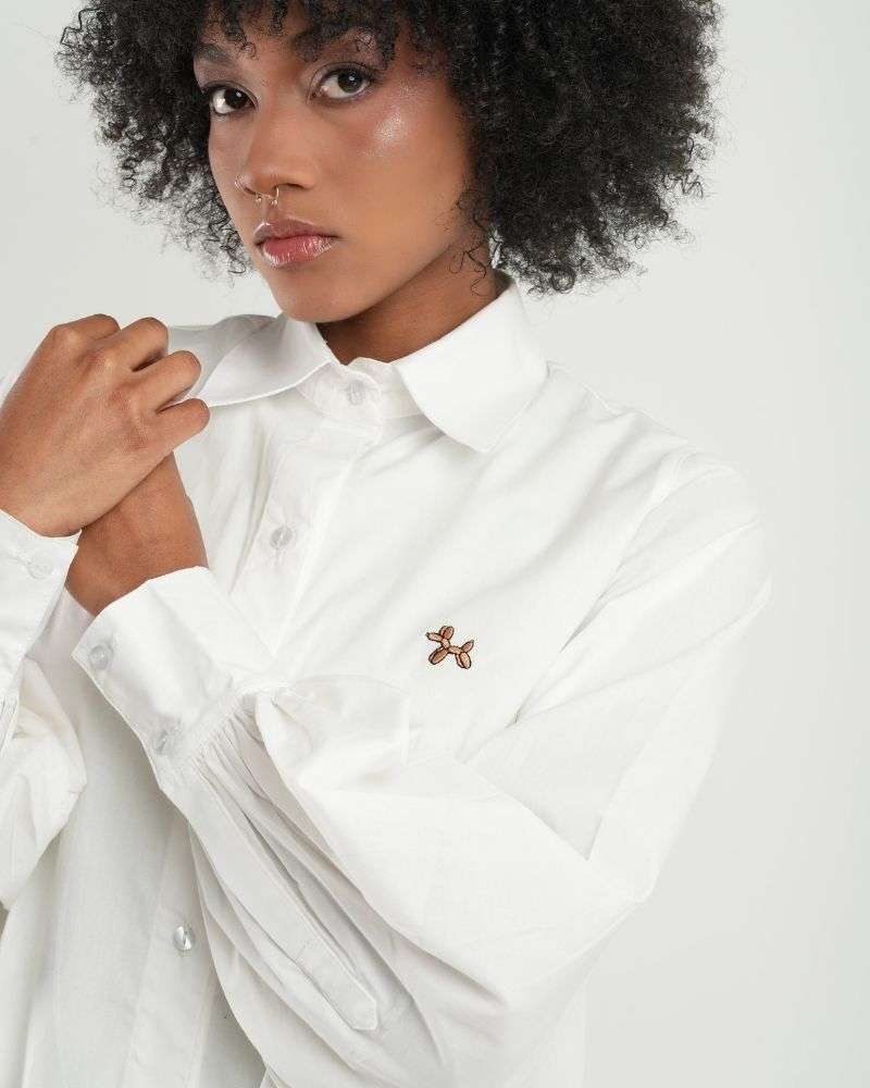 Camisa con cuello y mangas globo en algodón popelina al 100%, horma semi oversized, botones transparentes y bordado de perrito en color café en la parte frontal. Perfecta para combinar con jeans y leggings.