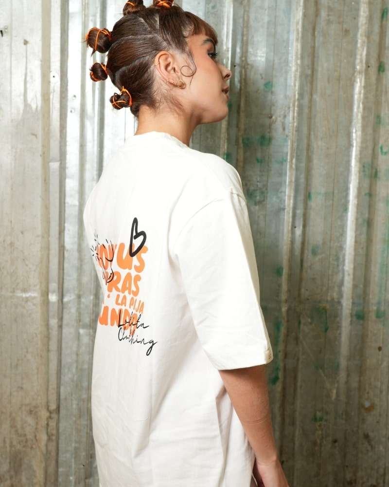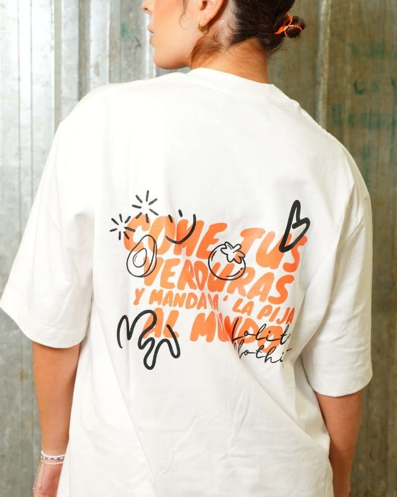 Camiseta marfil con estampado combinando técnicas plano y alta densidad en la parte de atrás "Come tus verduras y manda pa´la pija al mundo" y adelante el nombre de la marca en color negro y naranja, hecha en 100% algodón con silueta oversized, el cuello es en rib.