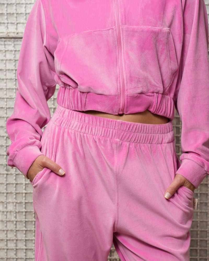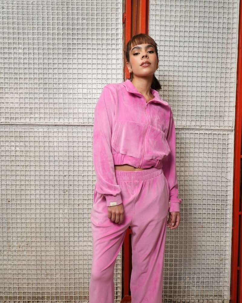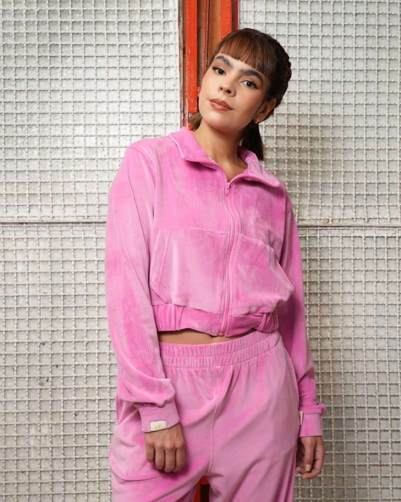 Chaqueta hecha en tela terciopelo/velvet color rosado barbie, silueta slim/clasica, semi corta, con cremallera tono a tono, bolsillos y bandera tejida en puño.