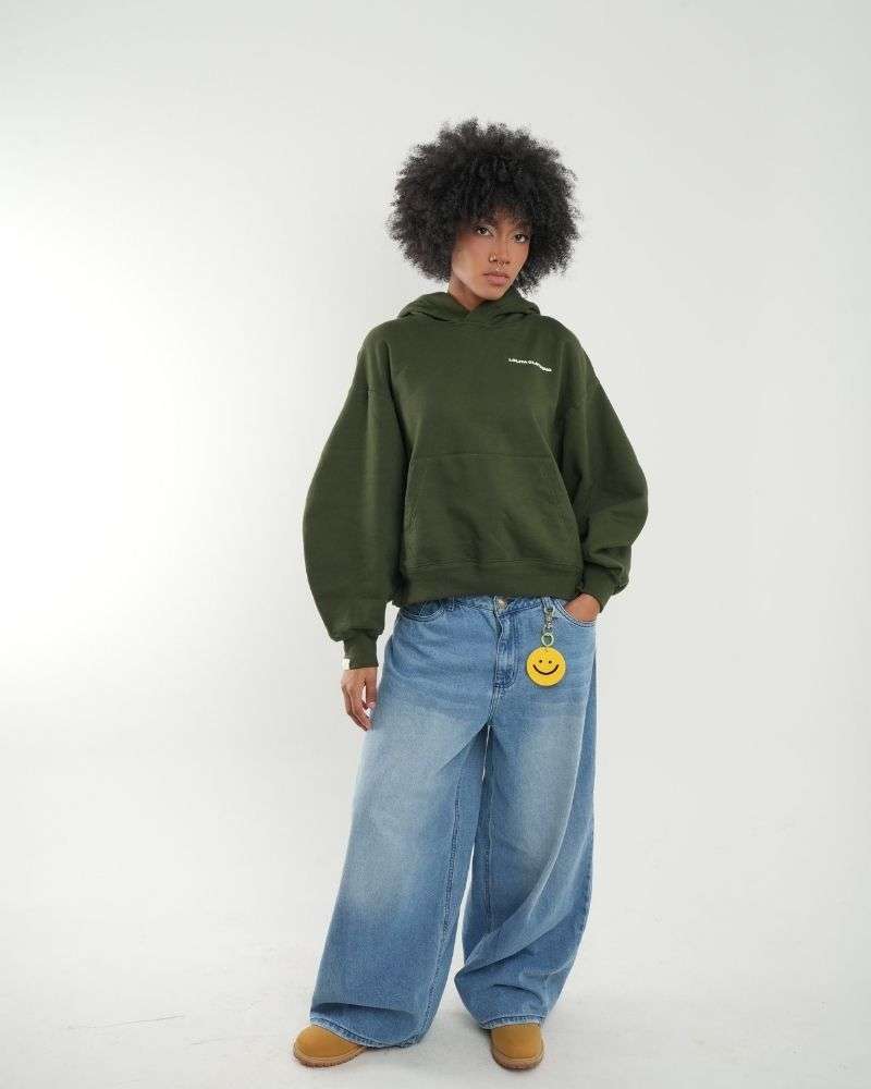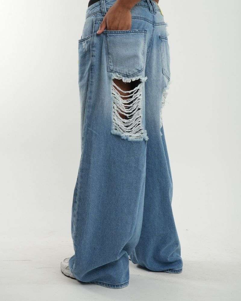 Pantalones hechos en denim 100% algodón azul con bolsillos frontales tradicionales, garra en color verde limón, rotos en parte trasera y bolsillos posteriores. Vienen con efecto desteñido. Silueta oversized semi descaderado y bota ancha.