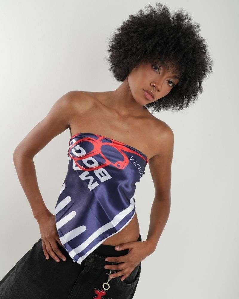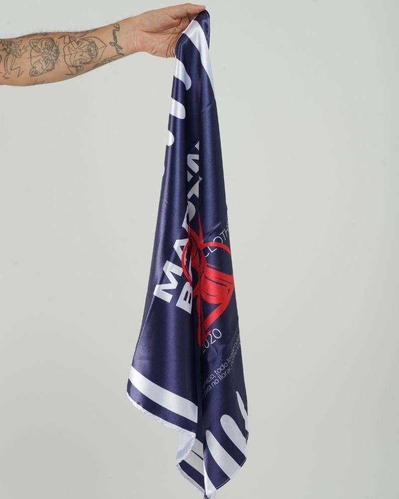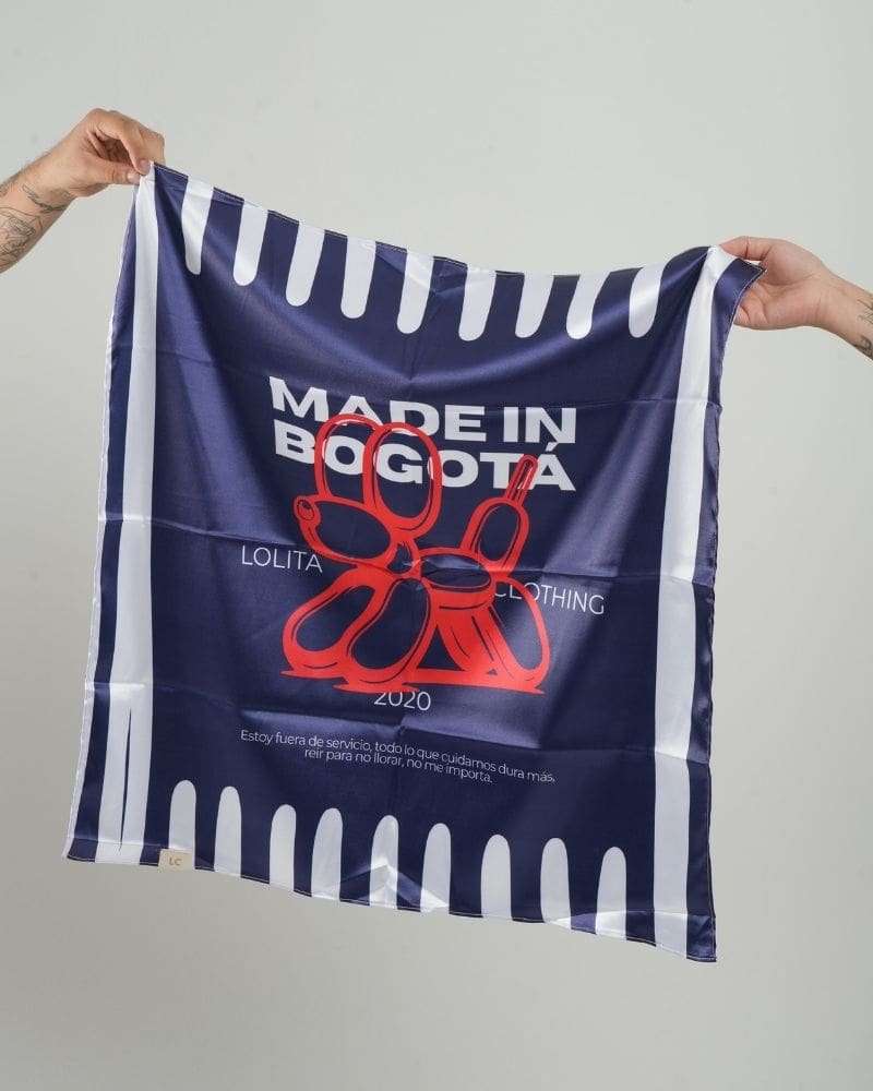 Pañoleta azul oscura estampado MADE IN BOGOTÁ en marfil y rojo cereza, está hecha en seda satinada semi licrada, con banderín tejido en borde. Perfecta para usar en cabeza, como top y accesorio.