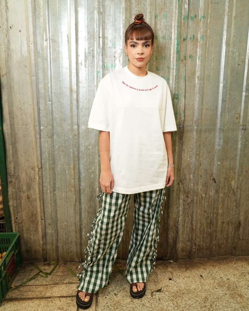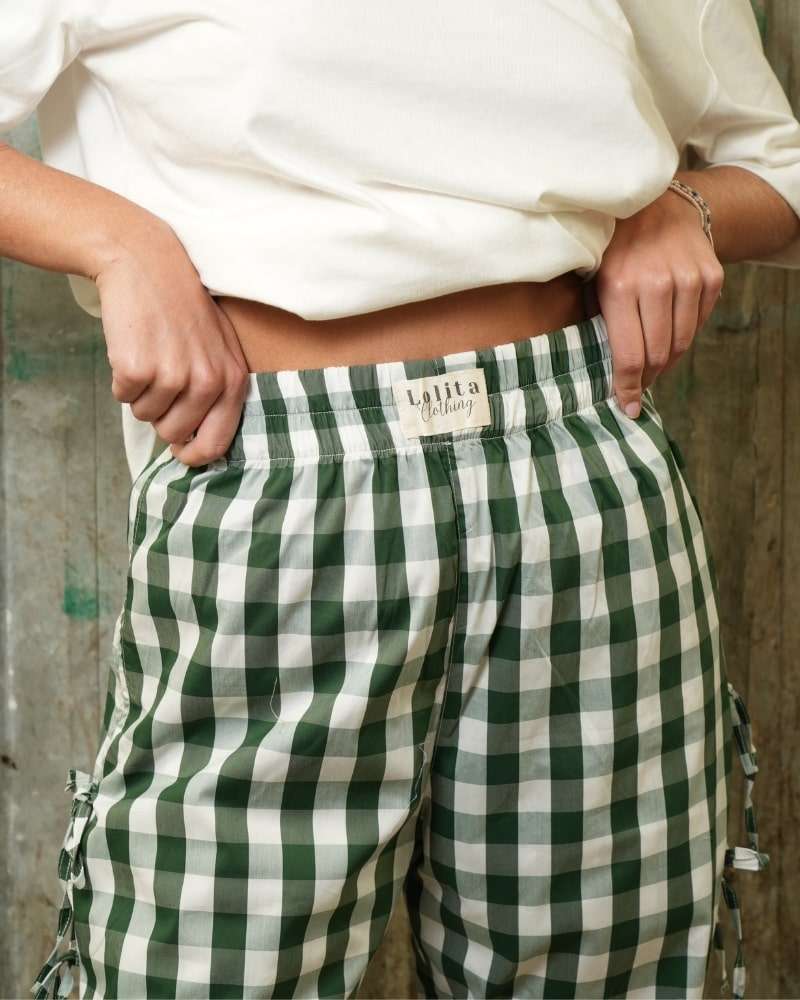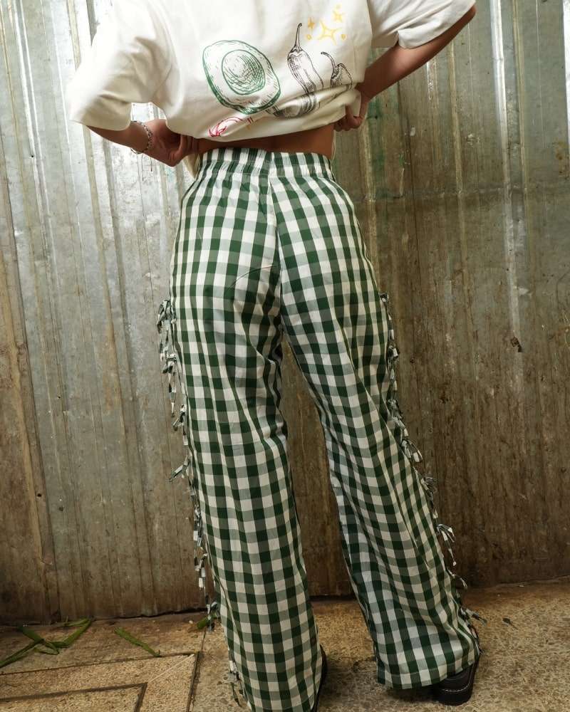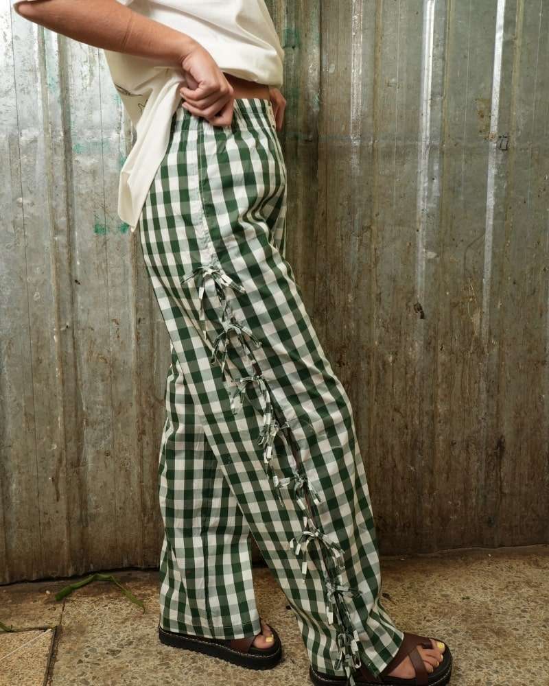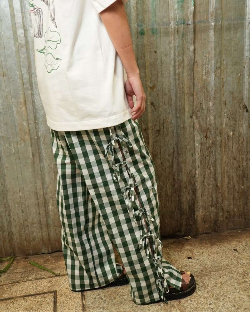 Pant hecho en algodon popelina 100%, color verde pino con cuadros blancos, horma regular, lazos que puedes desamarrar o amarrar en forma de moños, bota recta, perfecto para salir de viaje y combinar con nuestras camisetas oversized.